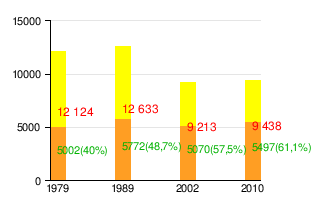 Изменение доли районного центра в численности населения района за 1979—2010 гг. по данным всероссийских и всесоюзных переписей[23][24][25][26][27][28][29][30]: