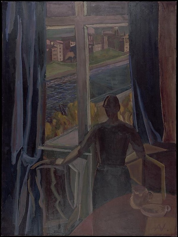 Вертикальная композиция изображает фрагмент интерьера комнаты с круглым столом и стулом у высокого окна. У окна спиной к зрителю стоит женщина, создавая ощущение уединённости и повседневности, характерное для бытового жанра. За окном открывается вид на Москву-реку и здания на противоположном берегу.