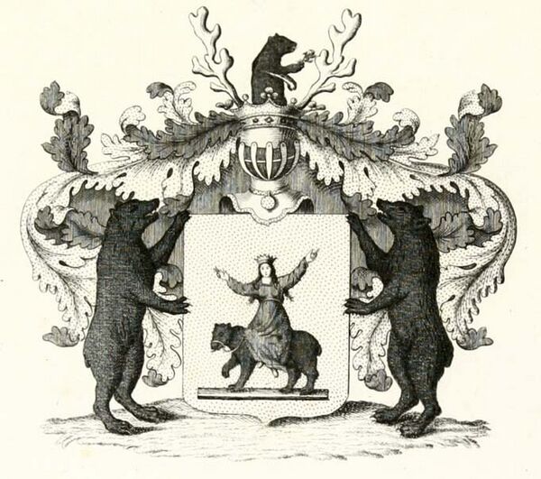 Описание герба: Выдержка из Общего гербовника В щите, имеющем золотое поле, изображён чёрный медведь с сидящей на нём девой в красной одежде, имеющей на главе венец и волосы распущенные, а руки вверх поднятые. Щит увенчан обыкновенным дворянским шлемом с дворянской на нём короной, на поверхности которой видны два лосиных рога и между них медведь, держащий в лапе Цвет. Намёт на щите золотой, подложен красным. Щит держат два медведя. |