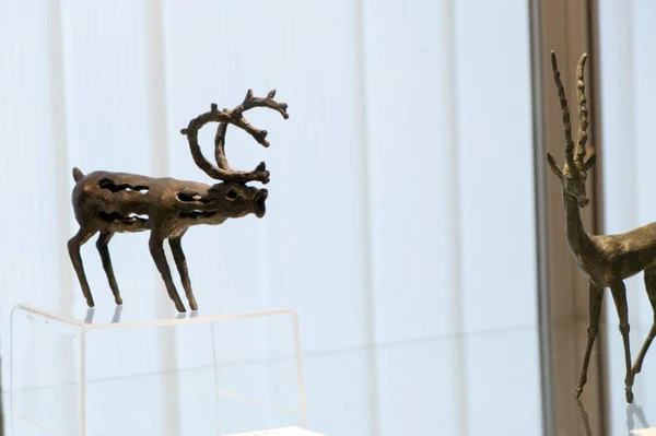 Скульптура изображает оленя с широко открытым ртом. Хвост животного поднят вверх, а длинные дугообразные рога наклонены вперёд. Ноги оленя расположены ровно, без признаков движения. Туловище выполнено с ажурными отверстиями, а глаза представлены в виде отверстий. На задней части под хвостом по кругу расположены пять треугольных вырезов. Изделие изготовлено из металла тёмного цвета. Размер работы составляет 15×9,5 см.