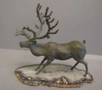 Скульптура представляет изображение оленя в натуральную величину. Олень изображён с широко расставленными ногами, что придаёт ему устойчивость. Тело животного удлинённое, а хвост небольшой. Голова украшена большими ветвистыми рогами. Фактура поверхности имитирует ворс. Объект установлен на подставке из камня неправильной формы. Размеры скульптуры составляют 19,0×9,0×26,0 см.
