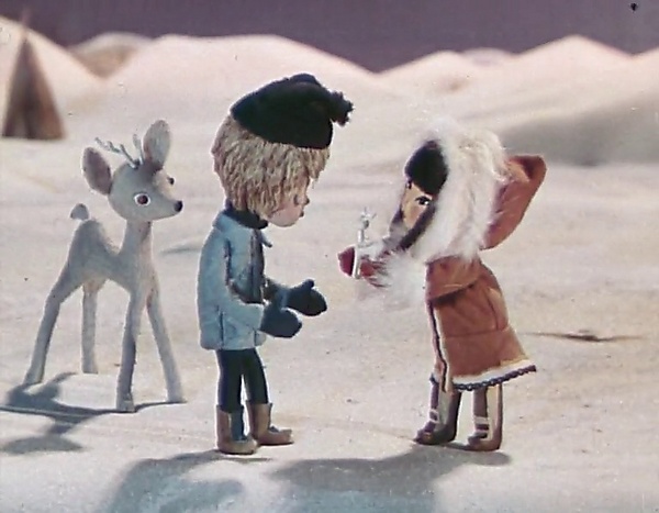Мальчик по имени Алёша из журнала Барвинок узнаёт о девочке Таянэ, живущей на Севере. После этого он мечтает побывать на Севере и увидеть северных оленей. В это время выпадает первый снег, и мальчик вместе с соседской девочкой выбегают на улицу. Алёша вылепливает из снега оленёнка, на что подружка смеётся, так как первый снег всегда быстро тает. Он уходит домой, а поздно вечером, выглянув в окно, замечает, что оленёнок вдруг ожил. Радости не должно быть конца, но мальчик понимает, что утром от нового друга ничего не будет, и тогда решается на отчаянное — отвезти оленёнка в далёкие холодные края. С помощью компаса, Алёша и его новый друг Олешка достигают Севера. Им нужно найти Таянэ, но эта проблема быстро решается благодаря тюленям. Друзья находят ярангу девочки, знакомятся с ней и её отцом, а Алёша объясняет причину своего прибытия. Олешку оставляют у Таянэ, чтобы тот не растаял у мальчика до зимы. Алёша просит приезжать в гости вместе с оленёнком, когда настанет настоящая зима, а сам улетает на вертолёте. Дома, Алёша, увидев из окна соседскую девочку, наткнувшуюся на лужу, слышит её смех, не подозревавшую куда на самом деле исчез оленёнок. Теперь мальчик спокойно дожидается начала настоящей зимы.