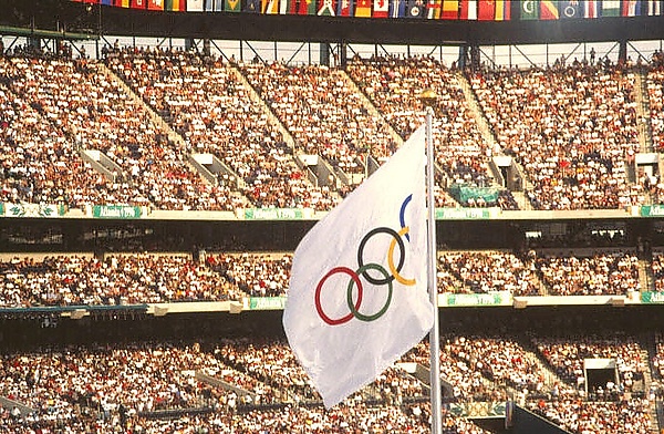 Флаг олимпийского движения представляет собой белое поле, в центр которого помещена олимпийская эмблема — 5 переплетённых колец, расположенных в 2 ряда (3 — в верхнем, 2 — в нижнем). Цвета колец (слева направо): синее, чёрное, красное, жёлтое, зелёное.
