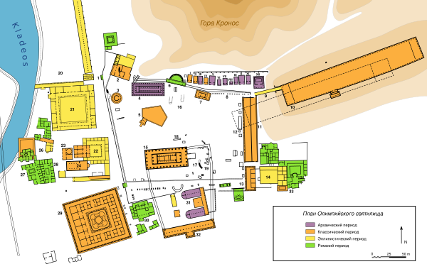 В центре расположена Священная роща (Алтис) — огороженное четырёхугольное пространство, на котором находились храмы. К востоку от Алтиса расположен стадион и, далее, ипподром (за пределами данного плана). За северной стеной, у подножия холма, находились сокровищницы с дарами городов. К западу — гостиницы и учебно-тренировочные площадки для атлетов, а также мастерская, где Фидий, предположительно, работал над статуей Зевса Олимпийского. К югу от Священной рощи располагалось место заседания олимпийского совета (булетревейон).