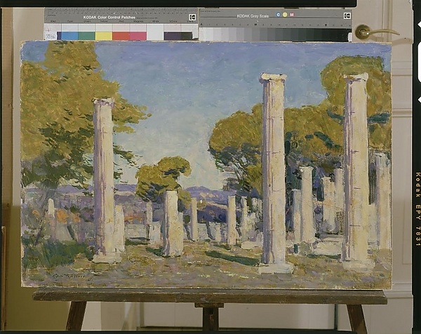 На картине изображены полуразрушенные колонны древнего храма, относящиеся к мотивам античной архитектуры, окружённые группами деревьев. Ярко голубое небо занимает значительную часть композиции, придавая работе особую выразительность в цветовой гамме.