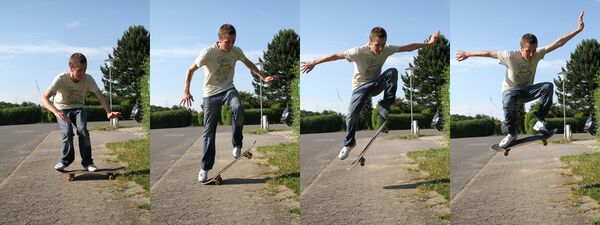 Скейтбордист начинает олли, приседая и прыгая прямо вперёд. Как только скейтбордист начинает прыжок, он, вместо того чтобы поднимать ногу, начинает «щелчок» хвостом (тейлом), ударяя его об землю, что заставляет подниматься нос доски первым. Сохраняя контакт с доской, скейтбордист поднимает переднюю ногу и сгибает переднее колено, так что верхняя часть ботинка скользит по направлению к носу доски. Трение между обувью и шкуркой помогает направлять и выталкивать доску вперед , выравнивая её в воздухе , в то время как задняя нога только поддерживает небольшой контакт с доской, чтобы помочь направлять её. При приближении к пику прыжка, скейтбордист поднимает заднюю ногу и толкает переднюю ногу вперед, что выравнивает положение доски и держит её в контакте с задней ногой.