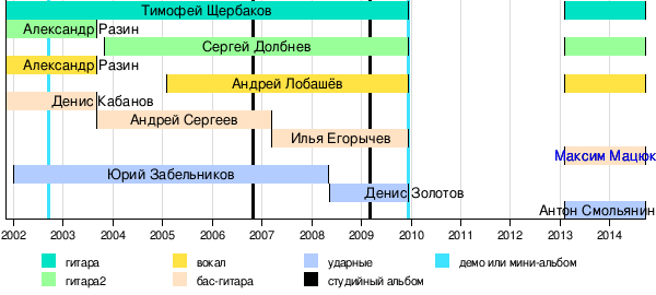 Тимофей Щербаков — гитара Сергей Долбнев — гитара Максим Мацюк — бас-гитара Антон Смольянин — ударные |