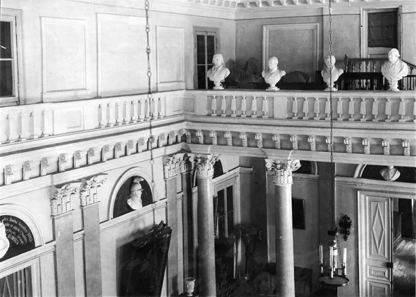 Внутри дома имелись два больших зала, отделанных в классическом стиле, из которых один выходит на парадный двор, а второй — в сторону парка. Последний зал, большой и двухсветный, по размерам немного уступает зеркальному залу в Кусково. Стены его украшены парными пилястрами. Колонны коринфского ордера поддерживают хоры. Всё в этом зале выполнено из дерева, вплоть до колонн, раскрашенных под мрамор. В люнетах между пилястрами помещены гипсовые барельефные изображения предков Апраксиных. Зал был обставлен ампирной мебелью работы крепостных. На стенах зала висели фамильные портреты как русских, так и иностранных художников.