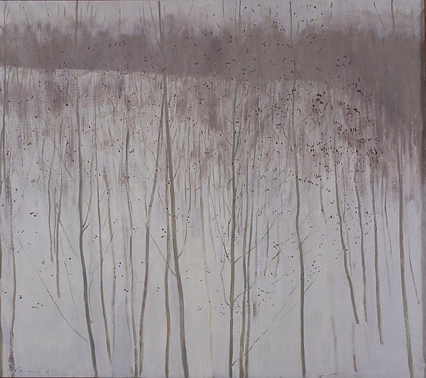 На полотне изображены тонкие серо-коричневые стволы деревьев, сквозь которые открывается вид на часть поля и лес, уходящий в даль. Композиция построена таким образом, что ритмичное расположение деревьев на переднем плане создаёт глубину пространства, подчёркивая особенности пейзажного жанра.