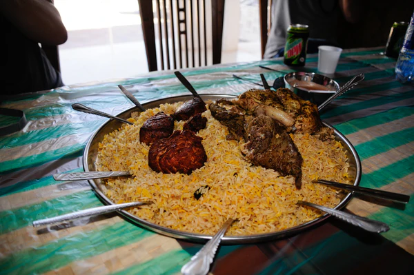 Основу питания оманцев составляют финики, ячменные или пшеничные лепёшки, просяная каша или варёный рис со специями. Также (в зависимости от достатка) употребляются мясо и рыба. Праздничное блюдо — жареная баранина или плов с бараниной. Но самым лакомым блюдом для оманцев (в отличие от арабов других стран) является мясо гиены. В то же время «кара» категорически не едят птицу и яйца.