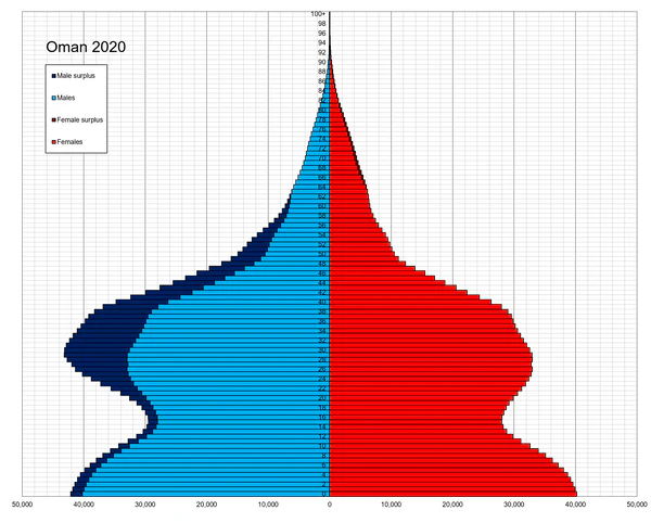 В 2021 году численность населения страны составляла 3 694 755 чел., из них в 2019 году 46 % составляли рабочие-иммигранты и члены их семей[7]. Городское население — 87 % (2021 год)[7]. Подавляющее большинство населения проживает в горах Аль-Хагар и вокруг них на севере страны; ещё одна группа меньшего размера находится вокруг города Салала на крайнем юге; большая часть страны остаётся малонаселённой. Суммарный коэффициент рождаемости на 2021 год — 2,73 рождений на женщину[7]. Грамотность — 95,7 %; мужчин — 97 %, женщин — 92,7 % (2018 год)[7]. Около 30,15 % населения составляет возрастная группа до 15 лет, 66,17 % — от 15 до 65 лет, 3,68 % — старше 65 лет[7]. В 2021 году рождаемость оценивалась в 22,58 на 1000 населения, смертность — 3,25 на 1000, иммиграция — −0,44 на 1000, прирост населения составил 1,89 %. Младенческая смертность — 14,76 на 1000 новорождённых[7]. Ожидаемая продолжительность жизни населения по состоянию на 2021 год — 76,64 лет, у мужчин — 74,69 лет, у женщин — 78,68 лет[7]. Средний возраст населения по состоянию на 2020 год — 26,2 лет (мужчины — 27,2 лет, женщины — 25,1 лет)[7].