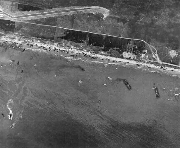 Несмотря на эти приготовления, почти весь план пошёл вразнос. Десять десантных судов были потеряны до того как они приблизились к берегу, залитые волнами. Несколько судов остались на плаву только благодаря десантникам, которые поспешно вычерпывали воду своими касками. Войска, ожидающие высадки, страдали от морской болезни. Десантные лодки боевой команды 16-го полка прокладывали путь среди солдат, борющихся за жизнь в бурном море и среди плотов, на борту которых находились выжившие члены экипажей затонувших DD танков[36]. Штурмовые корабли не могли определить своё точное местоположение, так как дым и поднявшийся туман скрывал береговые ориентиры, сильное течение сносило корабли к востоку[37].