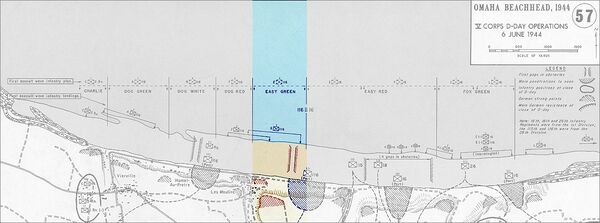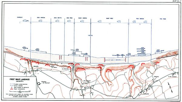 Из девяти рот первой волны штурма только рота А боевой команды 116-го полка в секторе Dog Green и рейнджеры на её правом фланге высадились, где им было предназначено. Рота Е боевой команды 116-го полка направлявшаяся в сектор Easy Green рассеялась по двум секторам пляжа, где должна была высадиться боевая команда 16-го полка[41]. Рота G боевой команды 116-го полка, стремящаяся в сектор Dog White, обнаружила 900-метровую брешь между собой и ротой А 116-го полка на их правом фланге, когда они вопреки плану высадились в секторе Easy Green. Рота I боевой команды 16-го полка сдрейфовала так далеко на восток, что высадилась на землю только спустя полтора часа[42].