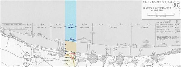 Почти вся пехота, высадившаяся с десантных судов, оказалась на песчаных отмелях длиной в 45—90 м. Чтобы добраться до пляжа, им следовало идти вброд 180 м или более, вода местами доходила до горла. Те, кто высадились на гальке, прошли эту дистанцию со скоростью пешехода, поскольку были тяжело нагружены. Большинству отрядов пришлось мужественно встретить интенсивный обстрел из стрелкового оружия, миномётов и блокирующий пулемётный огонь по площадям[43]. В секторе Dog Red противостоящий опорному пункту Les Moulins после обстрела из корабельных орудий загорелась трава, появившийся дым скрыл высаживающиеся войска, огонь защитников потерял свою эффективность[41]. Некоторые подразделения рот G и F 116-го полка смогли достичь возвышения из гальки почти без потерь, хотя рота F утратила организацию после потери своих офицеров. Рота G 116-го полка смогла сохранить некоторую сплоченность, но вскоре при попытке пойти на запад и достигнуть предназначенной ей цели попала под огонь направленный вдоль отмели и пришла в беспорядок[44]. Наиболее заметно рассеялись лодки вдоль фронта боевой команды 16-го полка, части рот Е и F 16-го полка и роты Е 116-го полка смешались, что помешало им пойти на импровизированный штурм берега, который мог бы переломить ситуацию, возникшую после неточной высадки. Рассеявшиеся части роты Е 116-го полка смогли избежать тяжёлых потерь, хотя им пришлось побросать большую часть вооружения после того, как они, высадившись на песчаную отмель, натолкнулись на глубокую канаву и вынуждены были достигать берега вплавь[45].