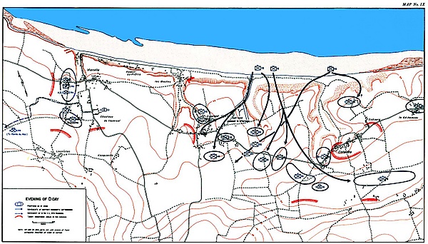 Подходы к выходам были также расчищены, минные поля были ликвидированы, в насыпи были пробиты проходы для движения транспортных средств. С падением прилива сапёры также смогли закончить свою работу по расчистке пляжных препятствий, к концу вечера были открыты и промаркированы 13 ворот[86].