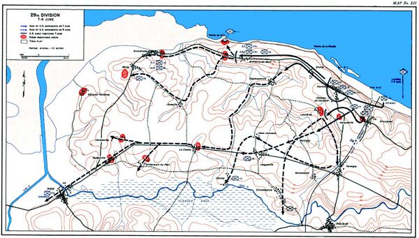 На фронте 29-й дивизии два батальона 116-го пехотного полка нейтрализовали последних оставшихся защитников утёсов. 116-й батальон присоединился к рейнджерам и двинулся с ними на запад вдоль побережья. Этот отряд деблокировал две роты рейнджеров, удерживающих Пуэнт-дю-Ок, 8 июня и впоследствии вынудил германский 914-й полк панцергренадеров и 439-й восточный батальон покинуть область Гранкан-Мези, лежащую дальше на западе. Утром 7 июня защитники покинули опорный пункт WN-69, защищавший Сен-Лоран, таким образом, 115-й пехотный полк смог двинуться вглубь страны на юго-запад и 7 июня достиг области Форминьи лежащей на первоначальной линии продвижения в день D. 3-й полк 29-й дивизии (175-й) начал высадку 7 июня. К утру 9 июня третий полк взял Изиньи, а вечером 9-го передовые патрули полка вошли в контакт с 101-й американской парашютной дивизией, связав, таким образом, «Омаха-Бич» с Ютой-бич[98].