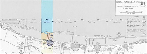Самые тяжёлые потери понесли части, высадившиеся на крайних концах Омахи-Бич. На востоке в секторе Fox Green и примыкающей к нему части сектора Easy Red рассеявшиеся подразделения трёх рот потеряли половину людей, прежде чем добрались до гальки, где оказались в относительной безопасности. Многим из них пришлось ползти 270 метров по пляжу, опережая наступающий прилив. Через 15 минут после высадки в секторе Dog Green на западном конце пляжа рота А 116-го полка оказалась разорванной на части, командиры выбыли из строя, потери достигли 120 человек[44][46][47]. Выжившим пришлось прятаться в воде или за препятствиями. Рейнджерам на правом фланге повезло больше, они нашли укрытие за скалами, но также потеряли половину людей.