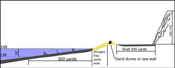 Литораль пляжа, обрамлённая скалистыми утёсами, плавно понижается. Расстояние от нижней до верхней отметки прилива составляет 275 м. Над линией прилива возвышается галечная мель высотой 2,4 м. Ширина мели в некоторых местах составляет 14 м. На западном краю галечной мели находится каменная морская дамба (далее на восток за ней начинается лесная чаща) высота которой варьируется от 1,5 до 4 м. Оставшиеся две трети пляжа за дамбой покрыты галькой, за галькой проходит низкая песчаная насыпь. За песчаной насыпью и дамбой идёт песчаная впадина сужающаяся на концах, шириной в 180 м по центру. Затем начинается крутой откос или утёсы, высотой в 30-50 метров. Они господствуют над всем пляжем и обрамлены небольшими заросшими долинами или обрывами, находящимися в пяти точках вдоль пляжа. Их обозначили от запада к востоку под литерами D-1, D-3, E-1, E-3 и F-1[2].
