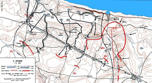 По завершении фазы штурма пляжа боевые команды полков были реорганизованы в пехотные полки, которые в течение следующих двух дней выполнили первоначальные цели дня D. 18-й пехотный полк развёрнутый на фронте первой дивизии пресёк попытки двух рот 916-го полка и 726-го гренадерского полка прорваться из опорного пункта WN-63 и Кольвилля, обе этих цели были впоследствии взяты 16-м пехотным полком, также выдвинувшимся в Порт-де-Бессён. Главное наступление было предпринято 16-м пехотным полком (которому был придан 3-й батальон 26-го пехотного полка) на юг и юго-восток. Наиболее упорное сопротивление было встречено у Форминьи где к силам 2-го батальона 915-го гренадерского полка подошло подкрепление в виде 2-го батальона 916-го гренадерского полка. Атаки 3-й роты 26-го полка и роты В 18-го полка при поддержке танков роты В 745-го батальона были отбиты и город держался до утра 8-го июня. Угроза контратаки бронетанковыми силами противника удерживала 18-й полк на защитной позиции весь остаток дня 8-го июня. Ещё вчера три батальона 26-го пехотного полка были приданы 16-му, 18-му и 115-му полкам, поэтому 8-е июня прошло в их сборе после чего было предпринято наступление на восток, что вынудило 1-й батальон германского 726-го гренадерского полка провести ночь в выходе из мешка, который образовывался между Байё и Порт-де-Бессён. Утром 9-го июня 1-я дивизия установила контакт с 30-м британским корпусом, образовалась связь между «Омаха-Бич» и «Голд-Бич»[97].