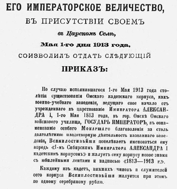 1 мая 1913 года в связи со 100-летним юбилеем Омского кадетского корпуса высочайшим приказом императора Николая II ему было присвоено имя императора Александра I и повелено корпусу впредь именоваться 1-м Сибирским императора Александра I кадетским корпусом. Всем чинам и кадетам корпуса на погоны и эполеты был пожалован вензель Александра I.