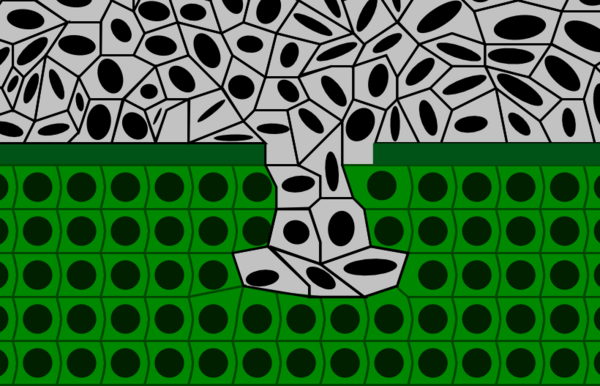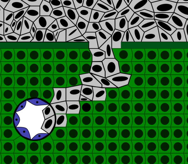 Рак in situ прорастает базальную мембрану. Опухолевые клетки разрушают и замещают собой предсуществующий эпителий. В дальнейшем раковые клетки врастают в лимфатические и кровеносные сосуды с последующим переносом опухолевых клеток и образованием метастазов.