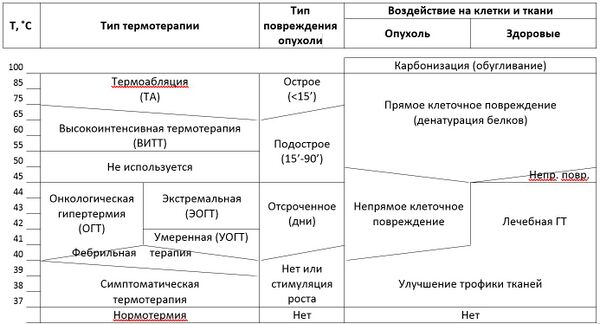 В диапазоне прямого клеточного повреждения (50-100˚C) выделяются два поддиапазона: подострого (часы) клеточного повреждения или т. н. высокоинтенсивной термотерапии (ВИТТ), и острого (минуты) повреждения или термоабляции (ТА). Условная граница между этими поддиапазонами лежит около 70˚C. (См. рис. «Виды термотерапии и их характеристика»).