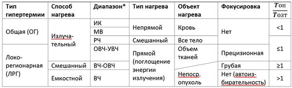 В связи с особенностями нагрева, только при емкостном нагреве (3-50 МГц) опухоль нагревается сильнее, чем окружающие здоровые ткани (Топ/Тозт>1). Во всех остальных случаях окружающие ткани нагреваются сильнее опухоли (Топ/Тозт≤1)[4].