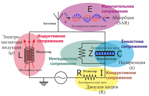 - Кондуктивное (резистивное) сопряжение Архивная копия от 15 октября 2014 на Wayback Machine осуществляется в проводящей части контура (резистор): энергия электрического поля передается посредством джоулевого нагрева Архивная копия от 8 декабря 2014 на Wayback Machine проводника, селективность нагрева обеспечивается различиями в сопротивлении (R). В чистом виде присутствует в совершенном проводнике (не обладающем ёмкостью).