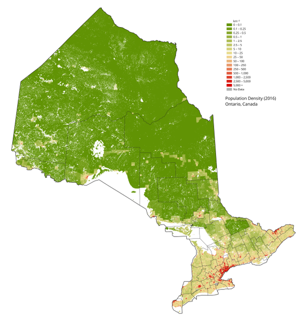 Население распределено чрезвычайно неравномерно. В регионе Северное Онтарио, что занимает 85-86 % территории, проживает всего 6 % населения; соответственно в Южном Онтарио, занимающем 14-15 % территории на Юго-Западе провинции, проживает 94 % общего населения провинции; более того, 3/4 обитает в урбанизированном районе Золотая подкова, где плотность достигает 256,7 чел./км², при средней по провинции — 13,4 чел./км², по стране — 3,5 чел./км². Доля городского населения составляет 85 %[30].