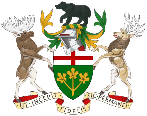 - Герб Онтарио — утверждён в 1868 году королевой Викторией, которая грамотой утвердила гербы всем четырём новообразованным провинциям Канады. Большой герб Онтарио разработан адвокатом из Торонто Эдвардом М. Чедвиком и добавлен в щит грамотой короля Эдуарда VII. Щит состоит из двух сегментов: вверху — крест святого Георгия, внизу — три золотых кленовых листа на зелёном фоне. Над щитом: чёрный медведь, стоящий на жёлто-зелёном венке. Левый щитодержатель — лось, правый — олень. Снизу — девиз[9].