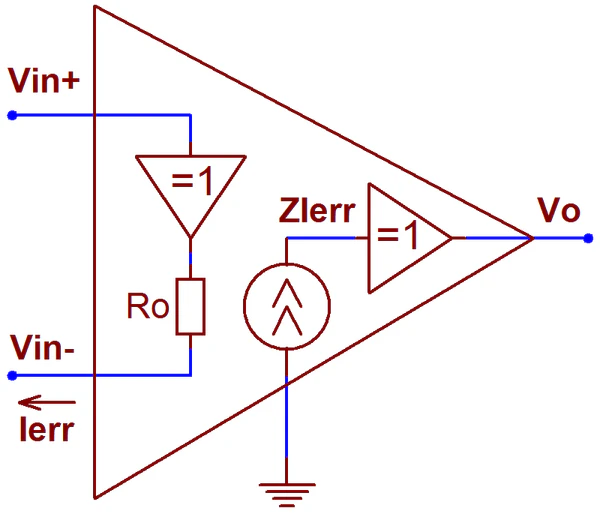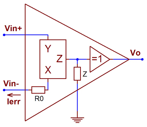 - Входным каскадом ОУ ТОС служит не дифференциальный усилитель, а повторитель напряжения, высокоомный вход которого является неинвертирующим входом ОУ ТОС, а низкоомный выход — инвертирующим входом ОУ ТОС. Таким образом, даже при разомкнутой цепи ООС напряжение на инвертирующем входе всегда повторяет напряжение на неинвертирующем входе. Сигналом ошибки служит не дифференциальное входное напряжение, а протекающий через инвертирующий вход ток [19].