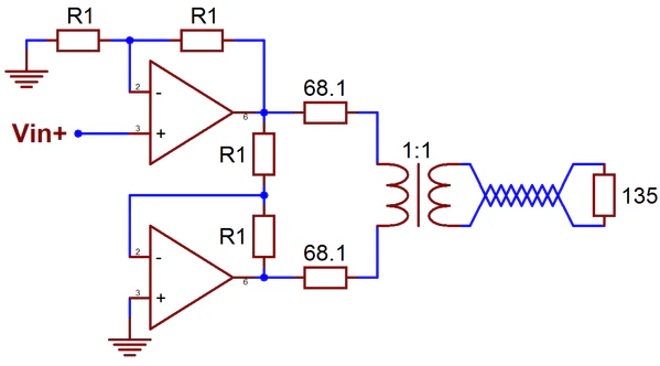 Типичное, массовое применение широкополосных усилителей на ОУ ТОС — выходные усилители (драйверы) устройств xDSL[25]. В схемах с балансным выходом источника сигнала применяется драйвер на двух ОУ в неинвертирующем включении; в схемах с однополюсным выходом источника один (ведущий) ОУ работает в неинвертирующем включении, другой (ведомый) в инвертирующем.