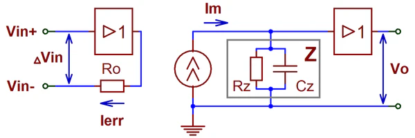 В верхнее и нижнее плечи питания входного повторителя включены два токовых зеркала, образующие совместно с повторителем неинвертирующий токовый конвейер второго поколения (CCII+). Генерируемый зеркалами разностный ток , равный или прямо пропорциональный выходному току повторителя , замыкается на условную «землю»[комм. 3] через частотно-зависимую цепь утечки с полным сопротивлением . Его активная составляющая (от сотен кОм до нескольких МОм) задаёт коэффициент усиления ОУ ТОС в области низких частот, а совместно с емкостной составляющей (доли пФ или несколько пФ) — частоту среза ОУ ТОС при разомкнутой петле ООС: , порядка нескольких сотен кГц[22][61]. Токовые зеркала и цепь утечки образуют управляемый током источник тока c подключённым к нему трансимпедансом . Получаемое при этом напряжение равно произведению .