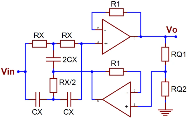 - Фильтр НЧ или ВЧ второго порядка, или заграждающий фильтр по схеме двойного Т-моста на паре ОУ ТОС. ФНЧ и ФВЧ на двойном Т-мосте сложнее и дороже фильтров Саллена — Ки, но намного удобнее в точной настройке АЧХ[131]. Заграждающие фильтры такого рода чрезвычайно требовательны к точности подбора всех пассивных компонентов моста, но других способов построить заграждающий фильтр на ОУ ТОС просто не существует[127].