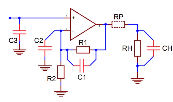 Ёмкость нагрузки, включённая между выходом ОУ ТОС и общим проводом, увеличивает фазовый сдвиг выходного напряжения и также может быть причиной самовозбуждения[80]. Подавить влияние выходной ёмкости можно либо увеличением сверх рекомендованного производителем, либо включением между выходом ОУ и ёмкостной нагрузкой развязывающего сопротивления номиналом в десятки или единицы Ом ()[80]. И тот, и другой способ сужают полосу пропускания и снижают скорость нарастания напряжения на нагрузке; оптимальное решение можно выбрать только опытным путём[80].