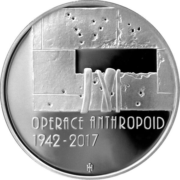 24 мая 2017 года Чешский национальный банк ввёл в обращение памятную серебряную монету достоинством в 200 чешских крон (диаметр 31 мм, масса 13 г, тираж 17000 экземпляров). На аверсе монеты изображена часть повреждённого взрывом автомобиля Гейдриха с надписями «ČESKÁ REPUBLIKA» и «200 Kč». На реверсе монеты изображены изрешечённое пулями окно крипты церкви Кирилла и Мефодия и пожарные рукава, с помощью которых атакующие закачивали воду в подвал. В нижней части реверса находятся надписи «OPERACE ANTHROPOID», «1942-2017» и инициалы дизайнера монеты Ирены Градецкой — переплетённые буквы «I» и «H»[64]. В этом же году Чешский монетный двор выпустил золотую памятную медаль, посвященную операции «Антропоид» (диаметр 28 мм, масса 15,56 г, тираж 99 экземпляров)[65]. Посвящённые операции «Антропоид» памятные медальоны из золота и серебра выпускал также Пражский монетный двор.