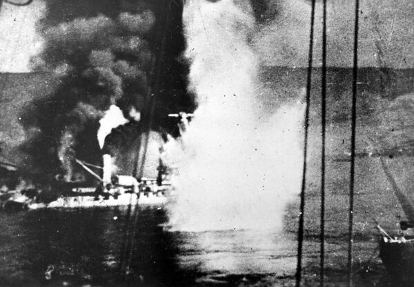 Третий снаряд упал в воду рядом с правым бортом чуть дальше в корму от второго, поднырнул под 225-мм пояс и пробил все конструкции между обшивкой и противоторпедной переборкой, при ударе о которую и взорвался. Его траектория в корпусе проходила в районе второго котельного отделения и первого машинного отделения, где располагались внешние валы. Взрывом уничтожило нижнюю броневую палубу на всём протяжении этих отделений, броневой скос над топливной цистерной, противоторпедную переборку и туннель правого борта для кабелей и трубопроводов. Осколки снаряда вызвали пожар в правом котле второго котельного отделения, повредили несколько клапанов на трубопроводах и перебили главный паропровод между котлом и турбоагрегатом. Вырвавшийся перегретый пар с температурой под 350 градусов нанёс смертельные ожоги персоналу котельного отделения, который стоял на открытых местах.
