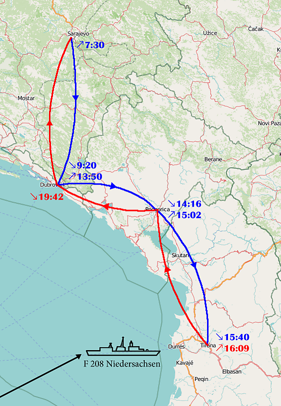 В 7:00 в боевую готовность были приведены три самолёта C-160 Transall на авиабазе Пенцинг (Германия) с экипажем (всего 24 человека, в том числе 6 санитаров). В 7:30 немецкие вертолёты вылетели из полевого лагеря Райловац в Дубровник. Последний вертолёт приземлился в Дубровнике в 9:20. Отсюда отряд наладил связь с вошедшим в албанские прибрежные воды неподалёку от Дурреса фрегатом «Niedersachsen». В 10:50 на базу прибыл военный атташе в Загребе подполковник Пер Шван (нем. Peer Schwan), который взял на себя все дальнейшие переговоры с хорватскими властями[20].