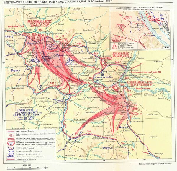 Наступление войск Юго-Западного и правого крыла Донского фронтов началось утром 19 ноября после мощной артподготовки. Войска 21-й и 5-й танковой армий прорвали оборону 3-й румынской армии, разрезали фронт противника на несколько группировок и окружили их. 23 и 24 ноября капитулировали две окруженные группировки во главе с генералами Ласкаром (св. 8 000 солдат и офицеров) и Стэнеску (св. 21 000 солдат и офицеров)[15]. Остальные румынские части обратились в бегство, фронт обороны на этом участке перестал существовать. Немецкие части, располагавшиеся сзади румынских войск, попытались остановить советские войска сильной контратакой, но успеха эта попытка не имела: они были разгромлены введёнными в бой 1-м танковым корпусом В. В. Буткова и 26-м танковым корпусом А. Г. Родина. Передовые части этих корпусов вышли в оперативную глубину, продвигаясь в район Калача[16].