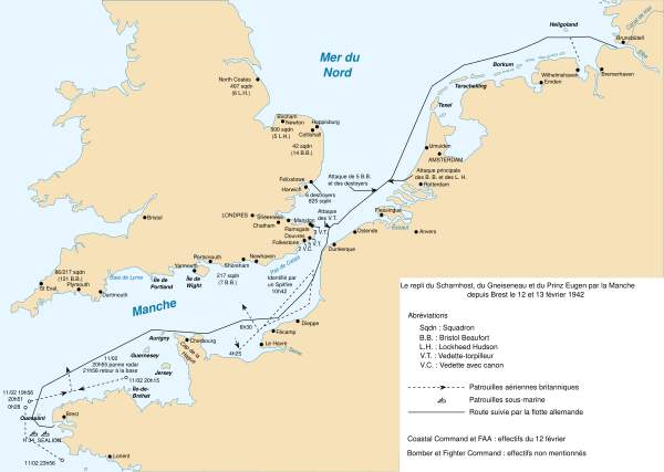12 января 1942 в ставке фюрера было принято решение о передислокации кораблей «брестской группы» в порты Германии. Расстояние между Брестом и Вильгельмсхафеном ~850 миль.