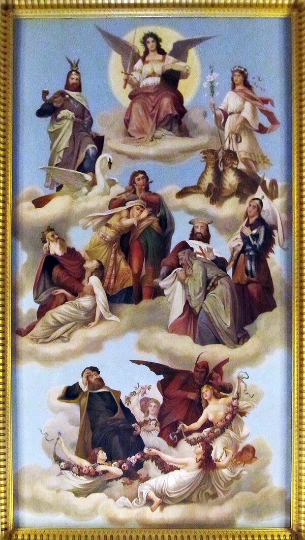 Свод авансцены Дрезденской оперы украшен фризом, на котором изображены персонажи известных драм и спектаклей. Ниже приведён перечень фигур, изображённых на фризе (слева направо): Папагено, мэр, Коломбина, Пьеро, Базилио, цирюльник, самум, Макс, Агата, Тангейзер, Фенелла, Мазаньелло, водовоз, Флорестан, Дон Жуан, Каменный гость, Донна Анна, Ифигения, Эвтерпа, Комо, Юстиция, Эвменида, Антигона, Эдип, Мельпомена, Отелло, Дездемона, Мефистофель, Гретхен, Фауст, Натан, Валленштейн, Донна Диана, Пук, скряга, Калибан, Капуцин, паж и Фальстаф.