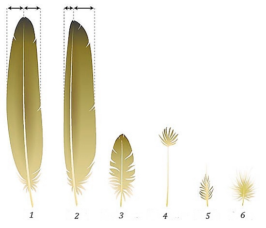 Общее число перьев у крупных видов больше, чем у мелких. Например, у колибри около 1 тыс. перьев, у мелких воробьиных — 1,5—2,5 тыс., у чаек — 5—6 тыс., у уток — 10—12 тыс., у лебедей — около 25 тыс. и т. п. Общее число перьев, их размеры и особенности строения варьируют и у близких групп в зависимости от их экологической специализации[3].