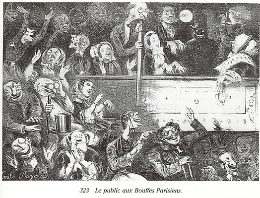 Уже в ранних одноактных произведениях Оффенбах неоднократно пародировал бельканто-оперу и гранд-оперу в стиле Мейербера. Их приёмы, которыми Оффенбах прекрасно владел, в камерном театре выглядели комично. Чтобы опередить критику, Оффенбах в трактате 1856 года[5] заявлял, что стремится возродить старую opéra comique XVIII века. Однако его произведения (за редкими исключениями, как Barkouf и Vert-Vert) исполнялись не в респектабельной Opéra-Comique, а на сценах парижских опереточных театров, ориентированных на публику полусвет. Среди зрителей были члены Жокей-клуба, а также представители императорской семьи, например Шарль де Морни, который не только был крёстным отцом сына Оффенбаха, но и под псевдонимом писал либретто для его оперетт (M. Choufleuri restera chez lui le...). В Meyers Konversations-Lexikon 1877 года отмечалось, что произведения Оффенбаха «настолько проникнуты духом полусвета, что их фривольные сюжеты и чувственная, зачастую тривиальная музыка оказывают явно разлагающее влияние на широкую публику»[4]. Подобные высказывания встречались почти во всех современных рецензиях, в том числе в Англии, Германии и Австрии, однако они скорее способствовали успеху оперетт Оффенбаха, чем вредили им. Это объясняет, почему долгое время оперетты Оффенбаха не ставились в придворных и буржуазных театрах, а исполнялись в специализированных заведениях, вызывавших скепсис у широкой публики. В Лондоне, а затем и в Париже и Вене, с 1850-х годов началась эпоха недорогих малых театров, известных как мюзик-холл, которые привлекали менее обеспечённую публику, в то время как состоятельные зрители посещали традиционные театры.