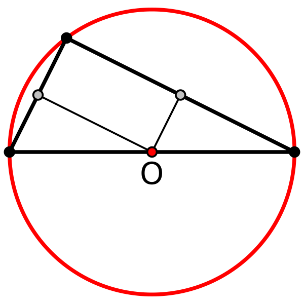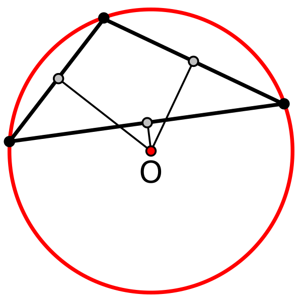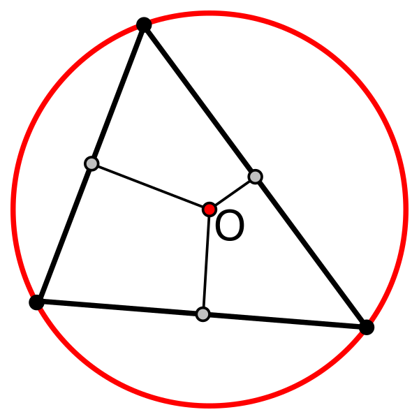 - 3 из 4 окружностей, описанных относительно серединных треугольников (образованных средними линиями треугольника), пересекаются в одной точке внутри треугольника. Эта точка и есть центр описанной окружности основного треугольника.