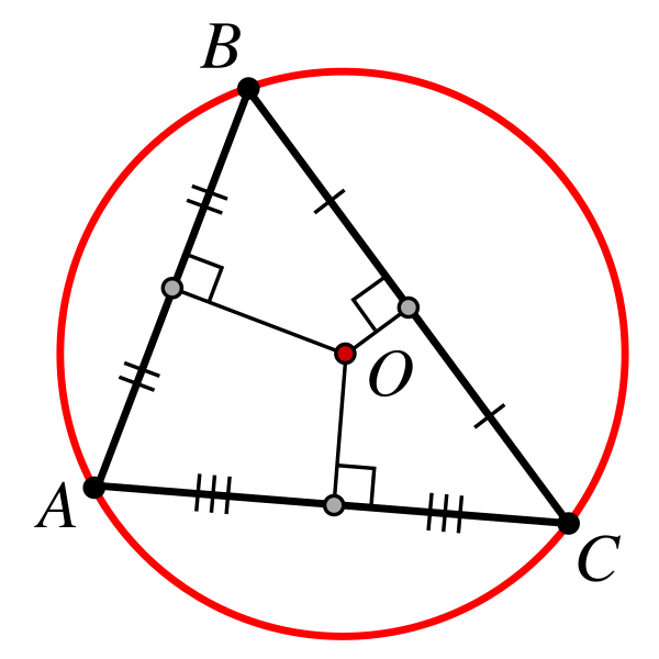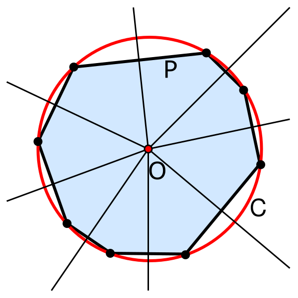 - Центр описанной окружности выпуклого n-угольника лежит в точке пересечения серединных перпендикуляров к его сторонам. Как следствие: если около n-угольника описана окружность, то все серединные перпендикуляры к его сторонам пересекаются в одной точке (центре окружности).