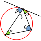 Углы, образуемые описанной окружностью со сторонами треугольника, совпадают с углами, которые образуют стороны треугольника, соединяясь друг с другом в вершинах. Сторона, противоположная углу α, дважды касается окружности: один раз на каждом конце; в каждом случае под одинаковым углом α (см. рис.) (аналогично для двух других углов). Это связано с теоремой об отрезке круга, дополнительном данному (the alternate segment theorem,), в которой говорится, что угол между касательной и хордой равен вписанному в окружность углу, опирающемуся на эту хорду.