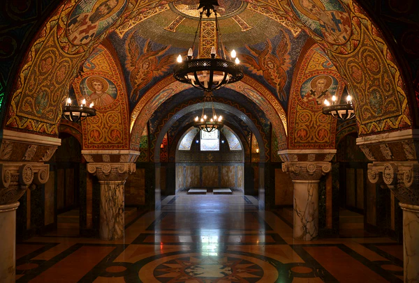 Крипта предназначена для захоронения умерших членов династии Карагеоргиевичей. В склепе находится 39 гробниц. Шесть поколений правящей семьи были похоронены в склепе, начиная с матери Карагеоргиевича Марики (умерла в 1811 году). Последние захоронения датированы уже XXI веком: в 2012 году здесь были перезахоронены останки бывшего принца-регента Павла Карагеоргиевича и его жены принцессы Ольги Греческой (погребённые ранее на кладбище в Лозанне)[5], а в 2016 году — их сын князь Александр Карагеоргиевич. Все могилы расположены в произвольном порядке без соблюдения критериев, таких как принцип генерации, степень родства, порядок смерти. При этом все они украшены мозаикой по всем поверхностям, из-за чего крипта кажется уникальной, но при этом является неделимым целым с храмом.