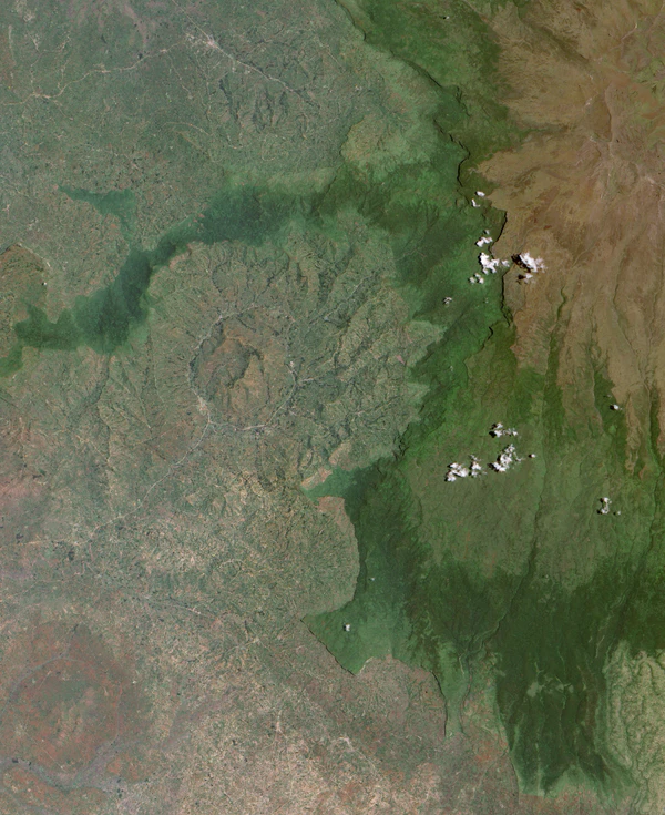 Гора Элгон — вулканический массив общей площадью около 3500 км² на границе с Кенией[16], имеющий форму щита диаметром 80—85 км, высотой 4321 м. Вершина плоская, с плохо сохранившейся кальдерой диаметром 11 км и площадью более 40 км². Первое извержение вулкана произошло более 24 млн лет назад[17], сейчас вулкан со всех сторон окружают труднопроходимые пики — высотой более 4000 метров. Наиболее древние туфы, нефелинитовые и фонолитовые лавы образованы в позднемиоценовый период, в более ранний период нефелиниты образовали кальдеру. Есть версия, что щит представляет собой несколько слившихся щитовидных вулканов[18]. Сложен в основном базальтами.