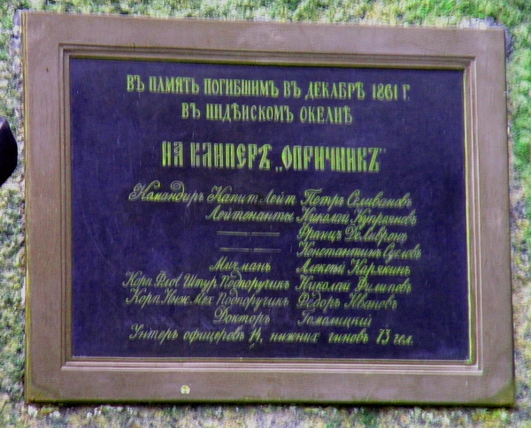 - В память об этом событии в юго-восточной части Летнего сада, недалеко от летнего здания кронштадтского Морского собрания, был открыт монумент, который был освящён 31 октября 1873 года. Также в этот день была отслужена панихида по погибшим морякам во всех церквях Кронштадта. Монумент был возведён по инициативе родственников и сослуживцев погибших моряков, которые с 1867 года организовали сбор средств. 10 июля 1872 года по Высочайшему разрешению и одобрению рисунка приступили к возведению монумента. По распоряжению управляющего морским министерством генерала-адъютанта Н. К. Краббе от кронштадтского порта были отпущены цепи, якорь и орудия. Флаг и флагшток были отлиты и установлены кронштадтским пароходным заводом. Иконниковым и Волковым был пожертвован камень, они же выполнили все каменные работы безвозмездно. Бронзовая доска с изображением клипера, находившаяся на южной стороне монумента, была утрачена. Вместо неё была закреплена металлическая доска с выгравированной надписью: «В память погибшим на клипере „Опричник“ в Индийском Океане в Декабре 1861 года»[3]. [1]