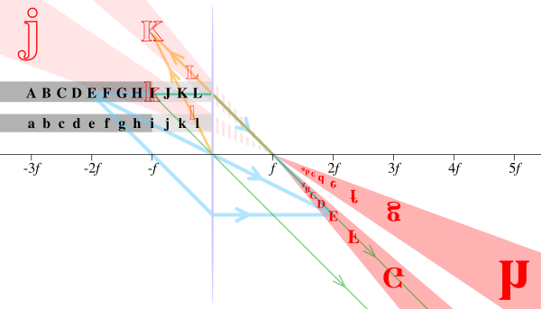 где — расстояние от объекта до линзы, — расстояние от линзы до изображения, а — фокусное расстояние объектива. В используемом здесь соглашении о знаках расстояния между объектом и изображением положительны, если объект и изображение находятся на противоположных сторонах линзы[42].